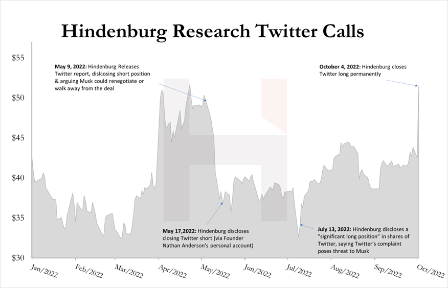 그리고 2달 후, 힌덴버그는 이번에는 트위터의 주식에 대해 롱(매수) 포지션을 갖고 있다고 발표합니다. 트위터가 머스크에 대해 소송을 제기하려 하니 머스크가 트위터를 인수할 수밖에 없을 거라고 봤습니다. 결국 머스크가 원래 계획대로 트위터를 높은 가격에 인수하면서 힌덴버그(와 이들의 추종자들)는 또 돈을 벌었습니다.