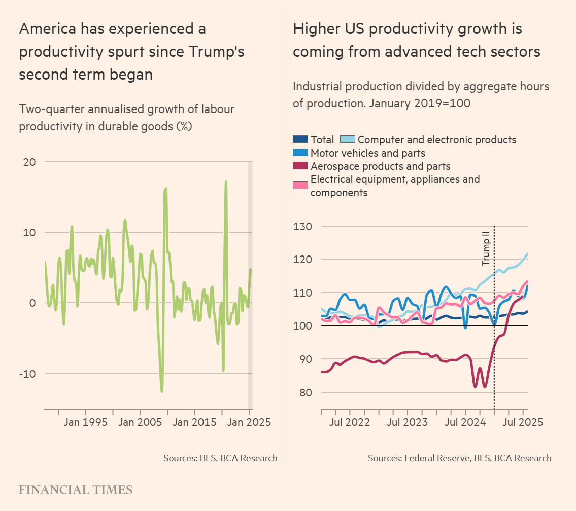 요컨대, 트럼프가 약속했던 “일자리 풍부한 제조업 르네상스”와는 다르지만, 미국에는 좁은 범위의 산업생산성 붐이 일어나고 있다. 이는 산업용 고부가 기술 부문 중심의 생산성 상승이며, 고용 창출보다는 효율 개선에 더 가깝다.