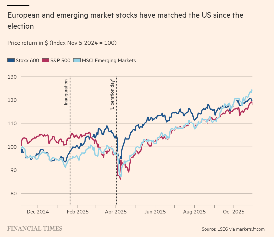'해방의 날' (트럼프 취임일) 이후 유럽과 이머징마켓 주가지수가 미국을 따라오기 시작