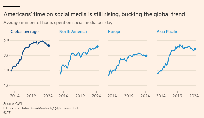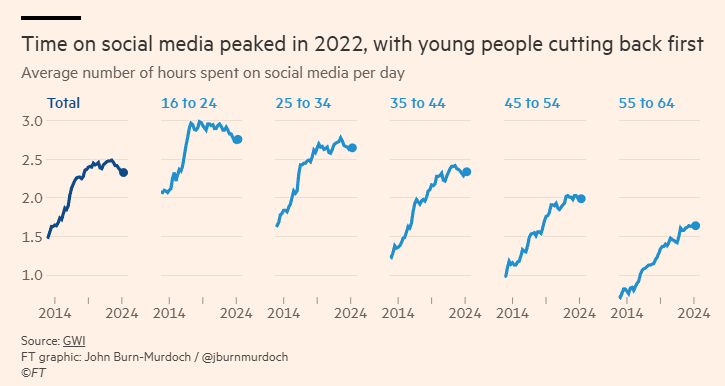 선진국 전반에서 16세 이상 성인들이 2024년 말 기준 소셜 플랫폼에 소비한 시간은 하루 평균 2시간 20분으로, 2022년 대비 거의 10퍼센트 감소했다. 특히 이 감소는 기존에 가장 많이 사용하던 10대와 20대 층에서 가장 두드러진다.