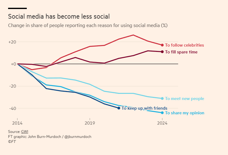 소셜미디어가 실제로 사람들에게 해를 끼치는지에 대해서는 논란이 많다. 그러나 소셜미디어 플랫폼이 근본적으로 '연결의 공간'에서 '고립과 산만의 공간'으로 바뀌었다는 점은 틀림 없다. 소셜미디어에 쓰는 시간은 본질적으로 다른 사람들과의 풍요로운 교류를 빼앗는 시간이다. 만약 그 흐름이 뒤집히고 있다면, 그건 결코 나쁜 일이 아닐 것이다.