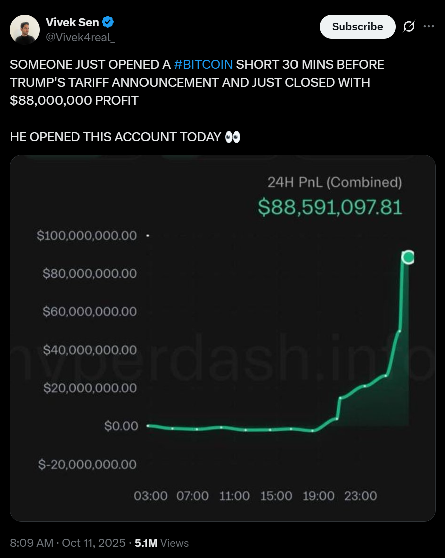 그런데, 네티즌들이 이상한 거래를 찾아냈습니다. 비트코인 관련 미디어를 운영하는 비벡 센(Vivek Sen)이라는 사람이 다음과 같은 글을 올렸습니다. 트럼프가 트루스소셜에서 100% 관세 발표를 하기 30분 전에 누군가 대규모로 10배 레버리지된 비트코인 숏 계약을 샀고, 이후 비트코인 가격이 폭락해 무려 8800만 달러의 이득을 챙겼다는 것입니다. 1300억원 정도 됩니다.