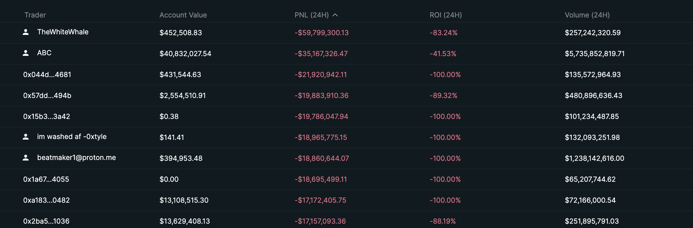 "오늘 Hyperliquid에서 10만 달러(약 1억 4천만 원) 이상 손실을 본 트레이더가 1010명, 100만 달러(약 14억 원) 이상 손실을 본 트레이더가 206명이었습니다.