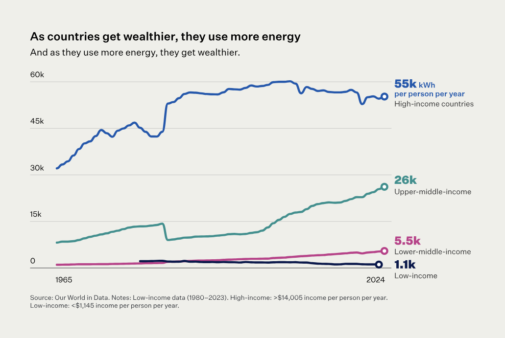 그런데 그게 꼭 나쁜 것이냐? 그렇지는 않아요. 위 그래프를 보세요. 사람들이 돈이 많아지면 자연스럽게 에너지 소비량도 늘어납니다. 그거 자체는 좋은 거에요. 왜냐고요? 에너지를 더 쓴다는 얘기는 경제가 성장한다는 얘기이고, 경제가 성장해야 시민들의 삶이 개선되니까요. 여러분도 집에서 전기 쓰잖아요? 에너지는 경제 성장의 핵심이에요.