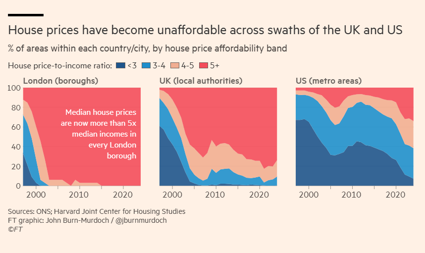 소득 대비 집값의 변화 (런던, 영국 전체, 미국 대도시 지역)