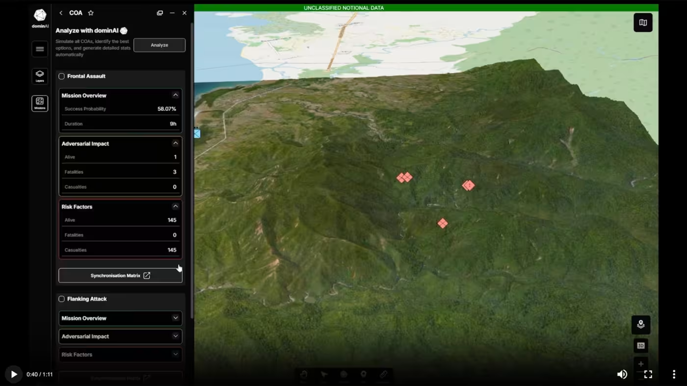 거의 즉시, 리투아니아와 스웨덴을 잇는 BCS 이스트-웨스트 인터링크 인터넷 케이블을 향해 가는 라이베리아 국적 선박 하나가 빨간 아이콘으로 표시된다. 선박의 프로필 데이터를 기반으로, 이 가상의 상황을 모니터링하는 AI 기반 소프트웨어 '도민AI(dominAI)'가 그 배를 잠재적 위협으로 식별한 것이다. 지휘관은 즉시 군용 드론이나 해군 함정을 보내 대응할 수 있다. 시스템은 이어서 각각의 대응책을 시뮬레이션하고 성공 가능성을 예측해 지휘관의 판단을 돕는다.