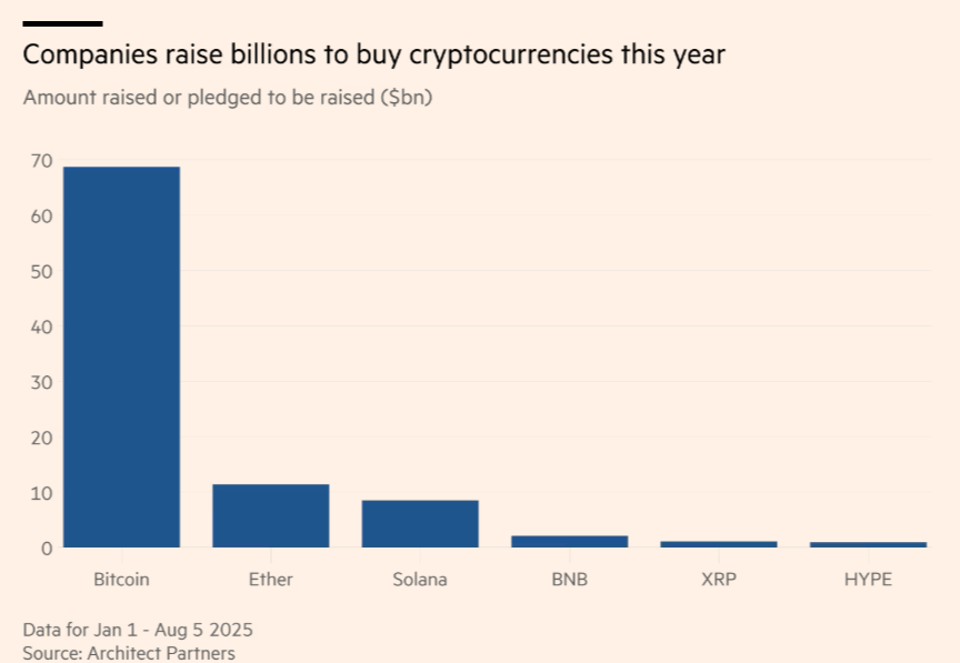 바이오테크 기업, 금광업체, 호텔업체, 전기차 회사, 전자담배 제조업체 등 다양한 기업들이 코인 매입에 나서고 있다. 이들은 코인을 직접 보유하지 않고 코인 시장에 간접 투자하려는 투자자들의 관심을 받는다. 코인 컨설팅사 아키텍트 파트너스에 따르면, 올해 8월 5일까지 총 154개 상장기업이 코인 매입을 위해 자금을 조달했거나 조달을 약속했다. 총액은 984억달러에 이른다. 일부 기업들은 스트래터지를 모방해 자사 웹사이트 색상을 비트코인의 상징색인 주황색으로 바꾸고, 보유 코인 수와 가격을 담은 대시보드를 제공하고 있다.