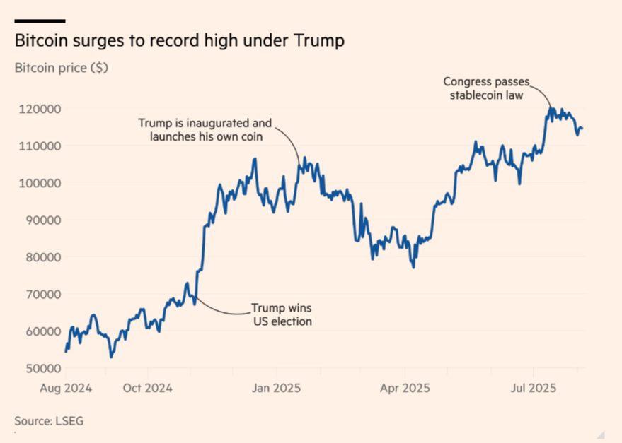 트럼프 전 대통령 본인도 이 흐름에 뛰어들었다. 그의 가족이 소유한 미디어 회사는 7월 비트코인과 관련 자산을 매입하기 위해 20억달러를 조달했다.