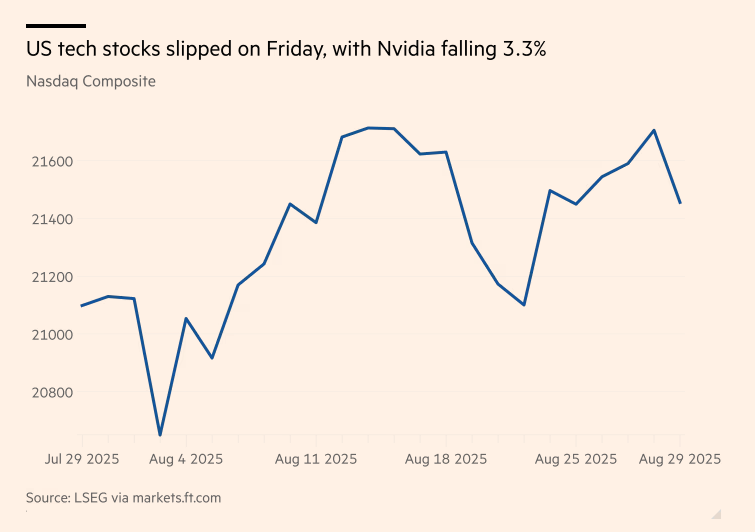 시가총액 4조 달러의 반도체 대기업 엔비디아는 이번 주 중국 매출 전망의 불확실성을 시사한 뒤 3.3% 하락했다. 주간 기준으로는 2.1% 내려 5월 이후 가장 큰 폭의 주간 하락을 기록했다.