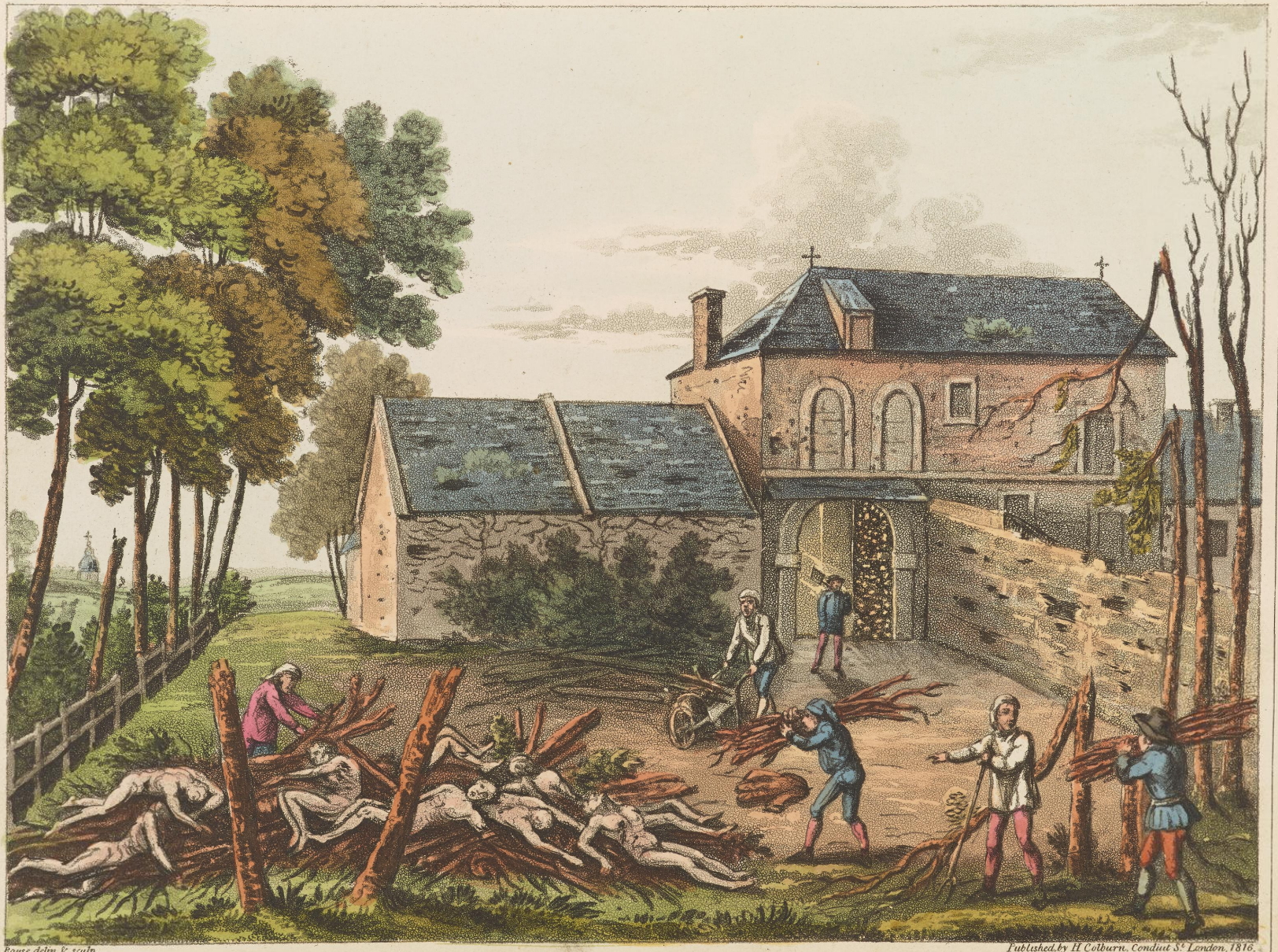 '일꾼들이 프랑스군을 태우는 우구몽 성' A view of the Château d'Hogoumont, workmen piling timber upon a pyre to burn the French dead by: C. C. Hamilton engraved by James Rouse