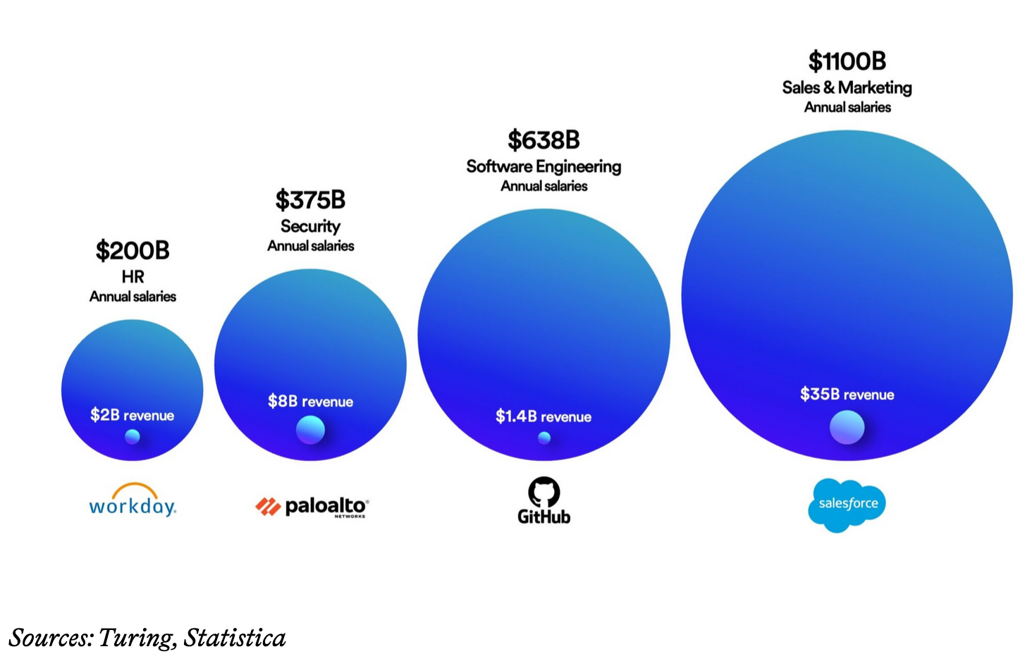 예를 들어, HR 시장만 해도 200조 원 규모로 추산되며, 세일즈 및 마케팅 영역은 무려 1,500조 원 규모에 이를 것으로 보고 있습니다.