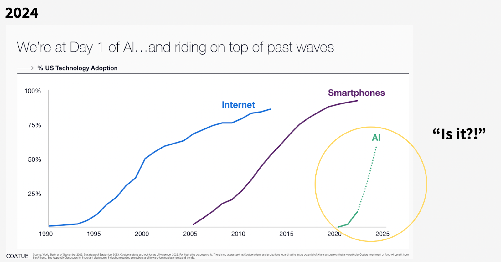 2024년 AI 시대의 관점에서 보자면, ChatGPT와 Claude 같은 AI 모델들이 수많은 데이터센터(Nvidia 반도체 + 클라우드 업체)와 함께 인프라를 구축하고 있는 중입니다. 과거 PC와 스마트폰이 막 태동하고 보급되던 시점과 비슷하다고 볼 수 있죠. 하지만 아직 AI를 기반으로 한 획기적인 서비스 성공 사례는 나오지 않았습니다. AI 시대가 이제 막 시작되었다고 평가받는 이유입니다.