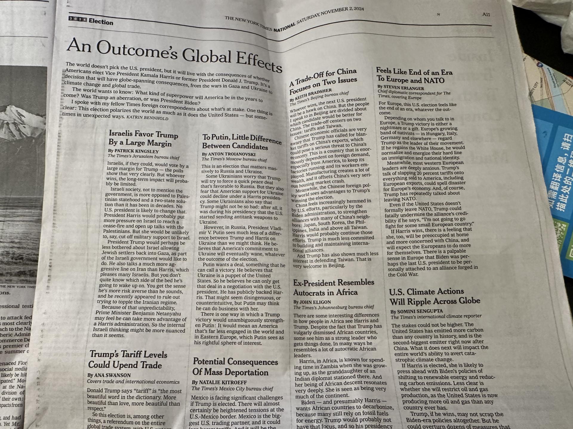 11면: 세계 각국은 둘 중 누구를 선호할까에 대한 기사. 소제목들에선 트럼프의 이름만 2번 언급됨.
