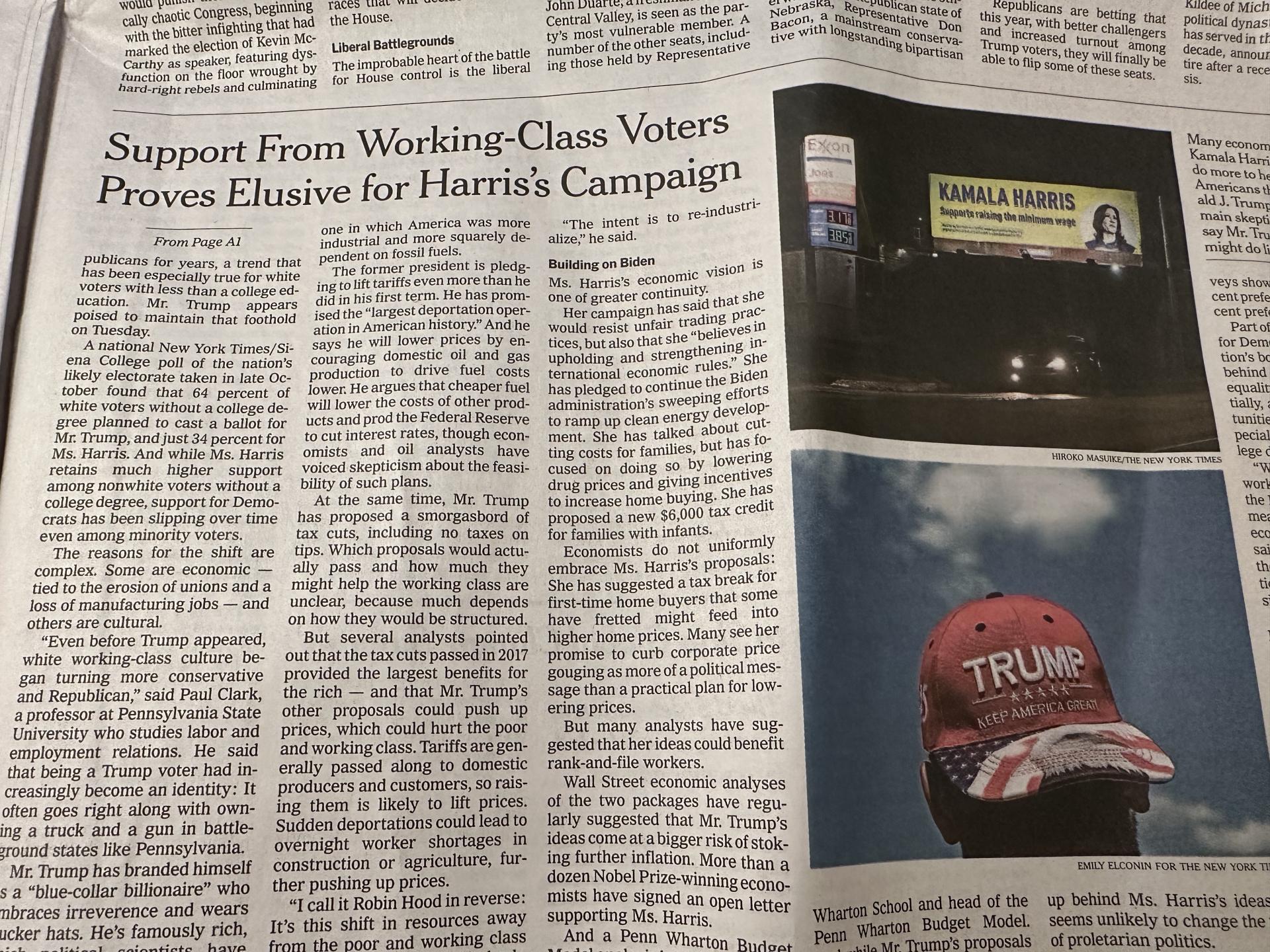19면: 해리스가 노동계층의 지지를 못 얻고 있다는 기사 (트럼프 모자 사진)