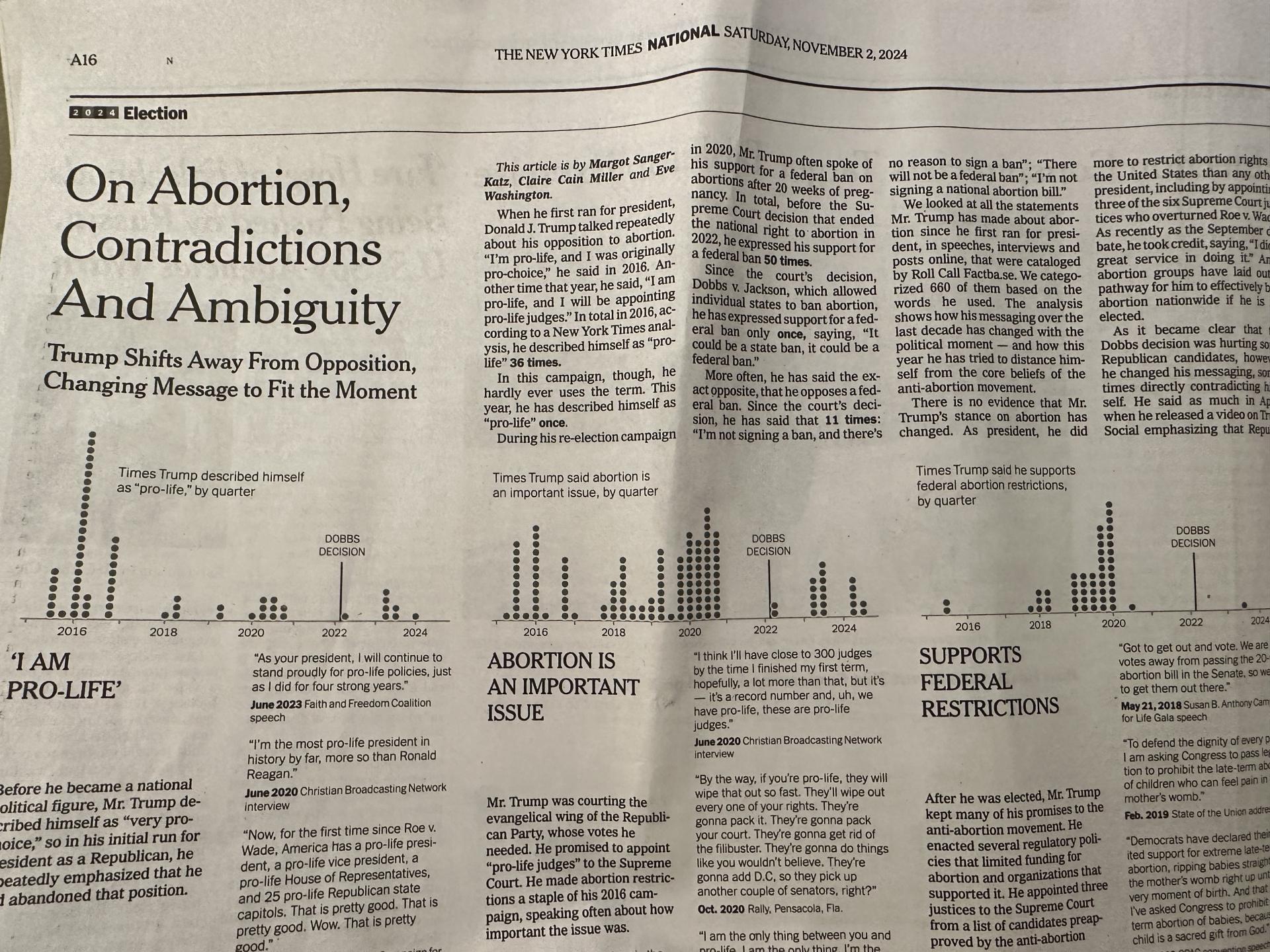 물론 이 기사들 대부분은 트럼프에 대해 부정적인 논조를 담고 있습니다. 뉴욕타임스는 해리스를 지지하니까요. 그렇긴 해도, 어떻게 이렇게 신문 처음부터 끝까지 트럼프 얘기만 하고 있는지 놀라울 지경입니다. 정작 해리스에 대한 얘기는 찾아보기 힘듭니다.
