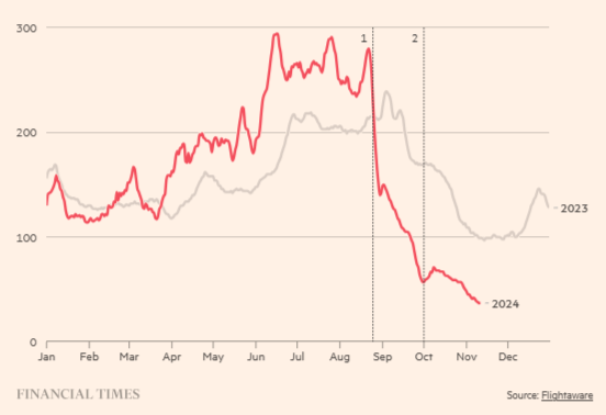 베이루트 공항 2023년 대비 2024년 출도착 건수.