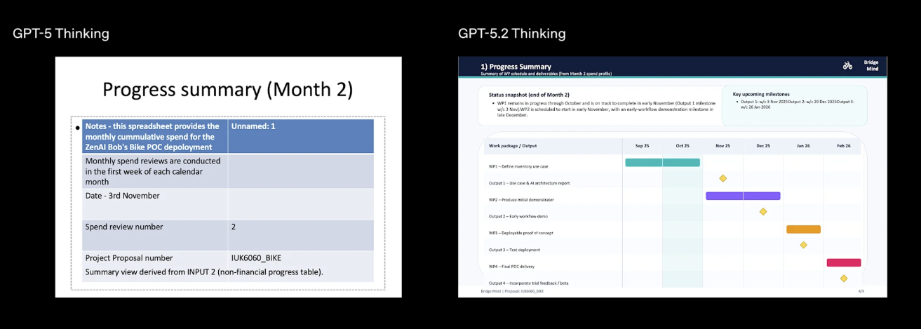 - 이번 업데이트 초점은 "돈 되는 일을 얼마나 잘하냐". 엑셀 서식, 재무 모델링, 법률 문서 같은 실무 44개 직종 평가에서 인간 전문가를 이기는 승률 70% 넘김. (위 그림은 프로젝트 매니지먼트 관련 PPT 만들어달라고 했을 때 이전 버전과 새 버전의 결과물 차이.)