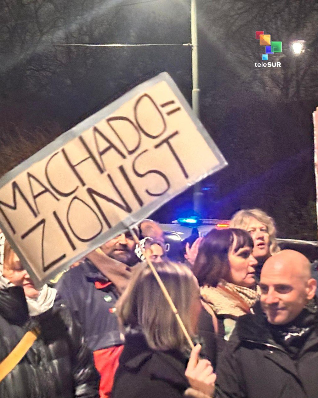 - 그러자 노벨연구소 밖에는 노르웨이 공산당 등이 참여한 시위대가 '전쟁광에게 노벨상은 없다'고 수상 반대 피켓시위를 열고, 여러 NGO들도 마차도의 수상을 축하하지 않기로. '마차도=시오니스트(이스라엘)'이라는 팻말도 나와. (유대인 아님)