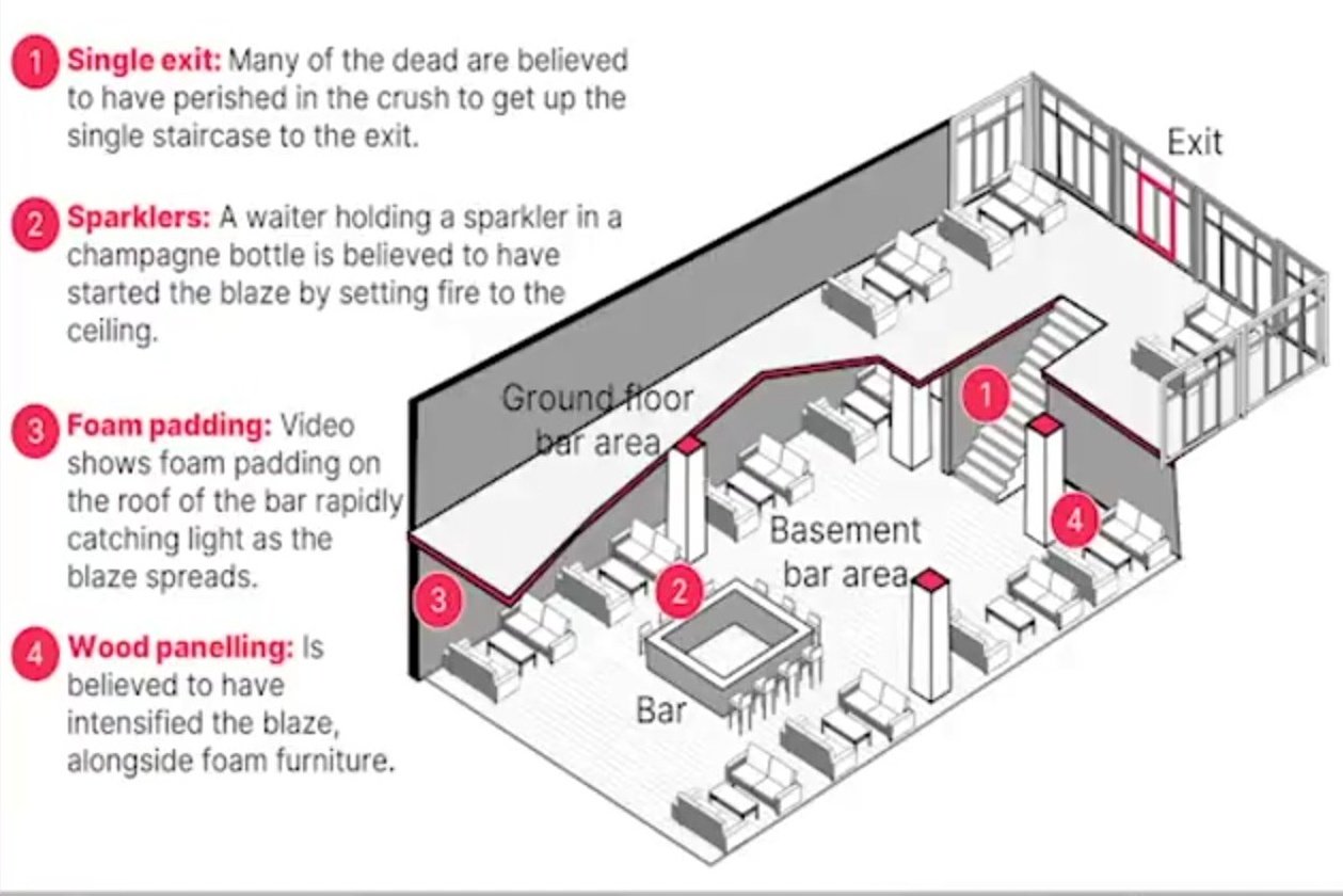 - 우리에겐 너무 익숙한 얘기: 불에 잘 타는 스티로폼 방음재 + 스프링클러 작동 안함 + 음악 안 끔 + 뒤늦게 출구에 몰리며 압사 혹은 질식.