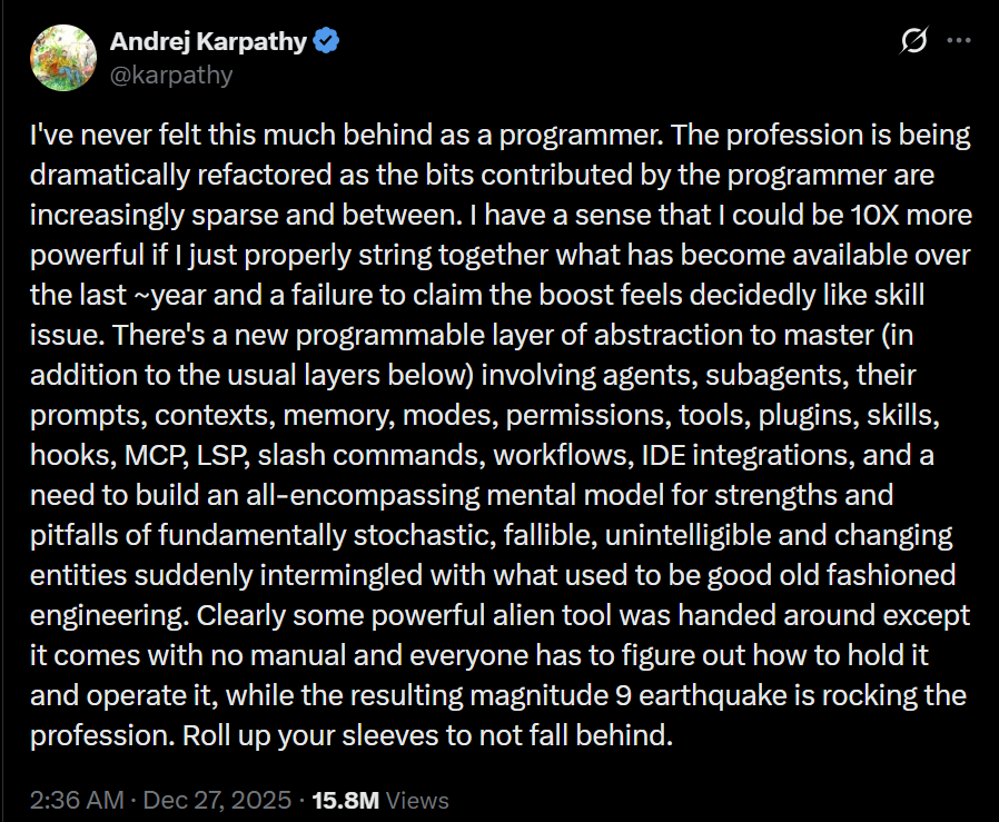 OpenAI 창업자이자 테슬라 AI 책임자였던 안드레이 카파시. 프로그래밍 개념 자체가 완전히 바뀌어서 자신마저 변화에 뒤쳐지고 있다며 자조. ( hada.io)