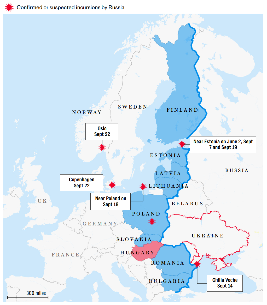 - 최근 러시아 것으로 보이는 드론들이 서쪽 여러 나라 상공에서 포착되자, '드론 만리장성'을 쌓자는 긴급 회의가 이번 주 소집됨. (텔레그래프) 재밍도 하고 격추도 할 수 있는 장비로 러시아 국경을 둘러치자는 것.