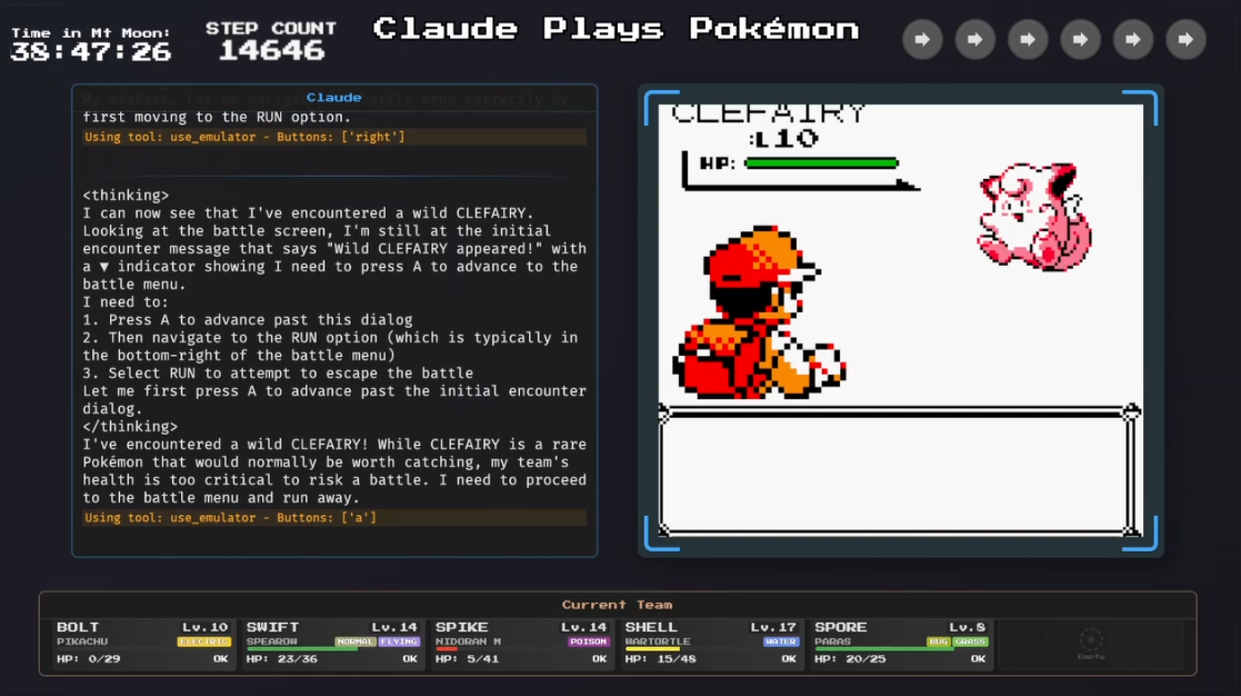 - 현재 클로드 사는 포켓몬 게임을 Sonnet에게 조작하게 하며 테스트(트위치에서 계속 생방송 중). 게임 화면 옆에는 클로드가 자신의 움직임을 설명하는 텍스트가 보여짐. 사람이 조작할 때보다는 느리지만 꽤 잘한다고. 여기서 조금만 더 발전하면 터미네이터 같은 로보트 조종도 가능해지는 것....